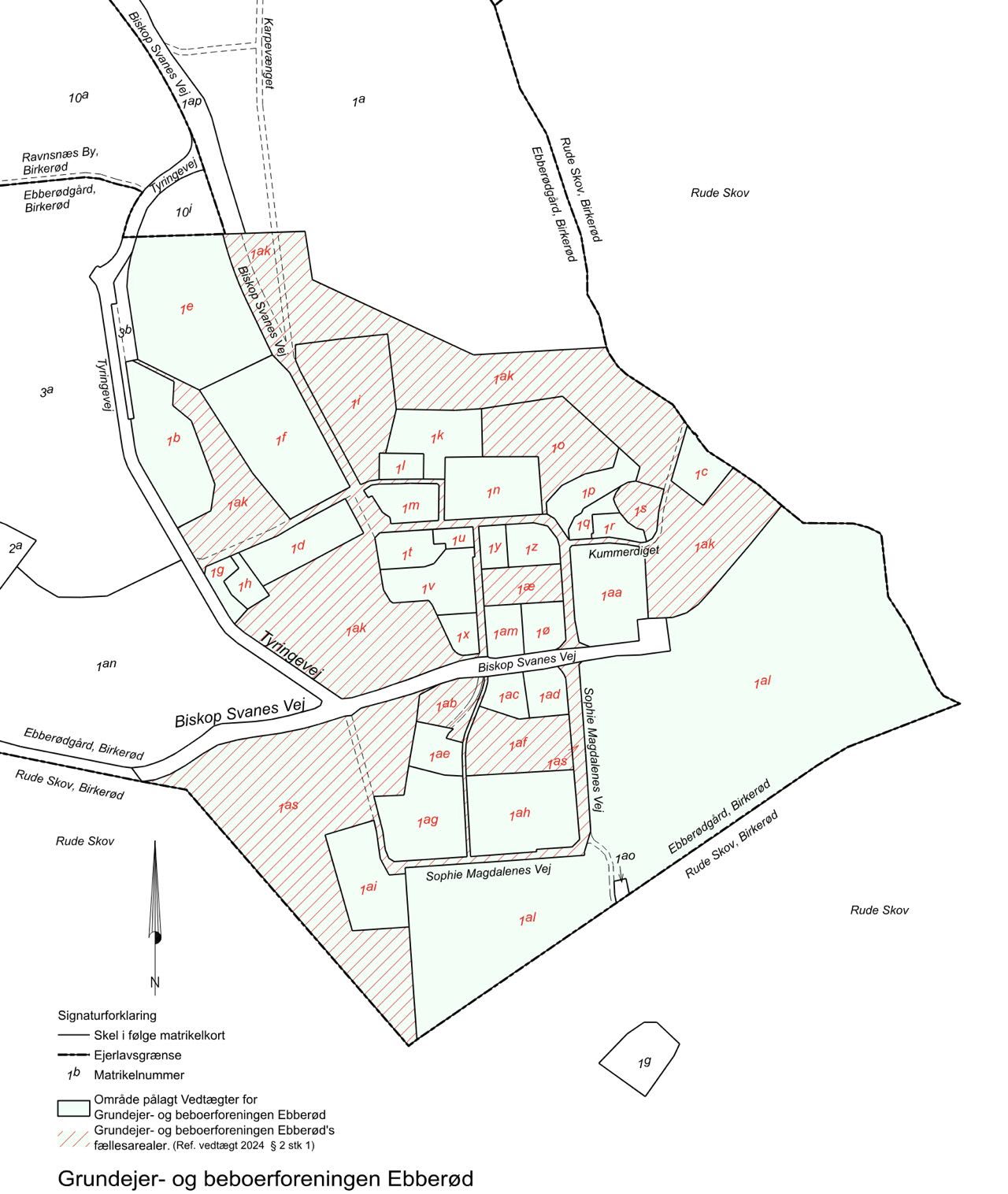 Matrikelkort over Ebberød – med angivelse af Grundejer- og beboerforeningens fællesarealer